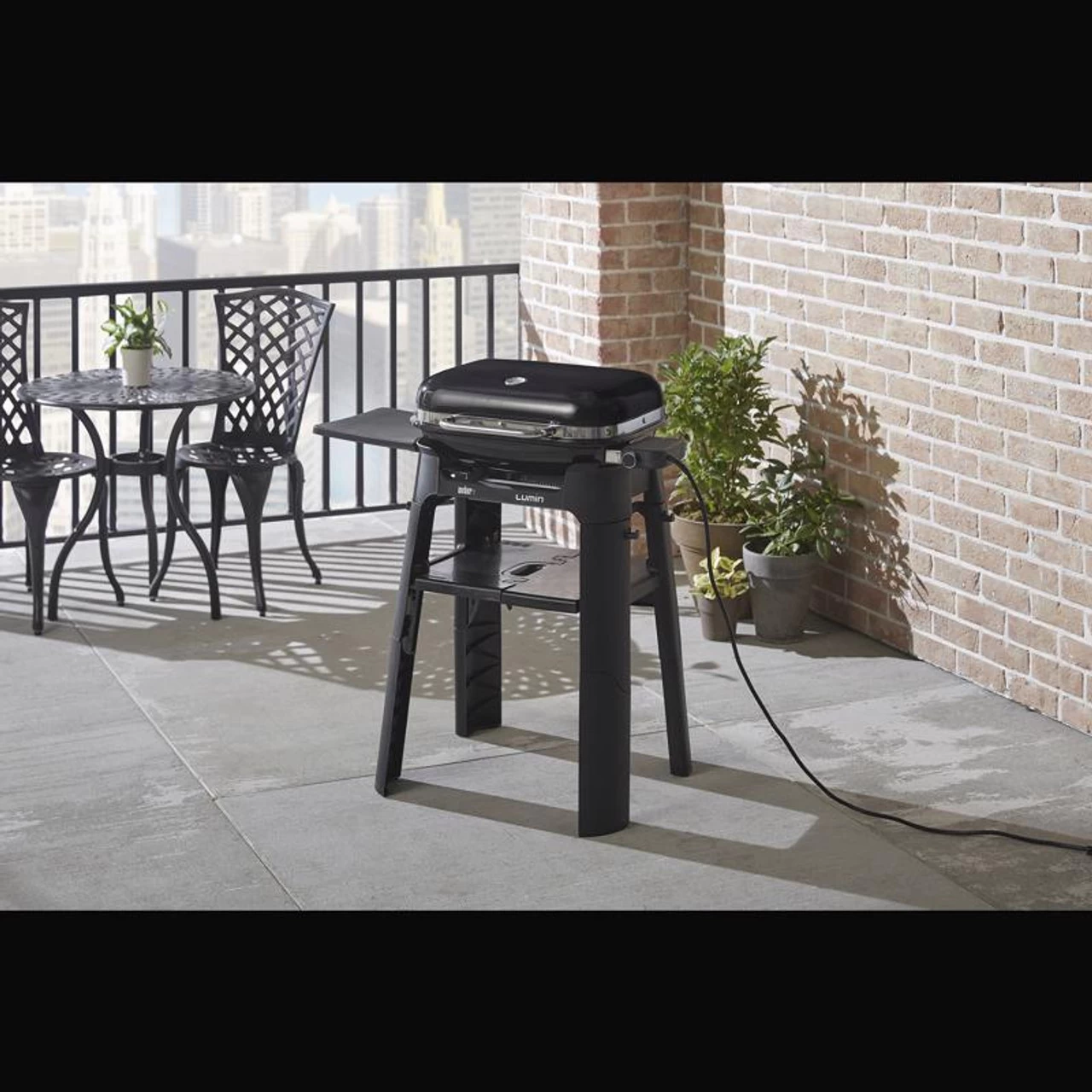 The collapsible stand is easy to set up and provides added space and built-in tool hooks. Modern and convenient, The Weber Lumin electric grill with stand is designed to suit both your taste and your outdoor space.