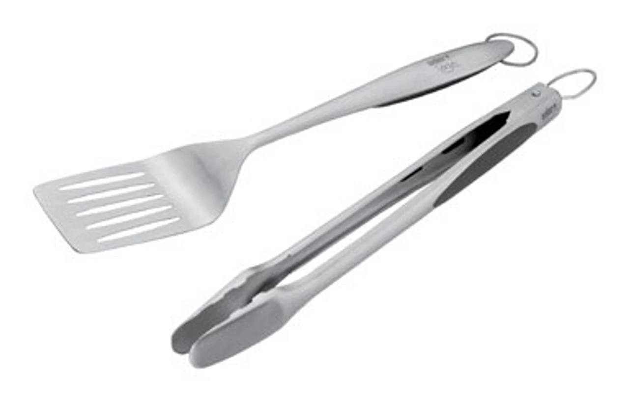 A spatula and tongs go together like salt and pepper. Whether flipping burgers, turning hotdogs or transferring beer can chicken from tray, two cooking grates, the spatula and hands-free locking tongs in the Deluxe Tool Set are two of your everyday grilling essentials.