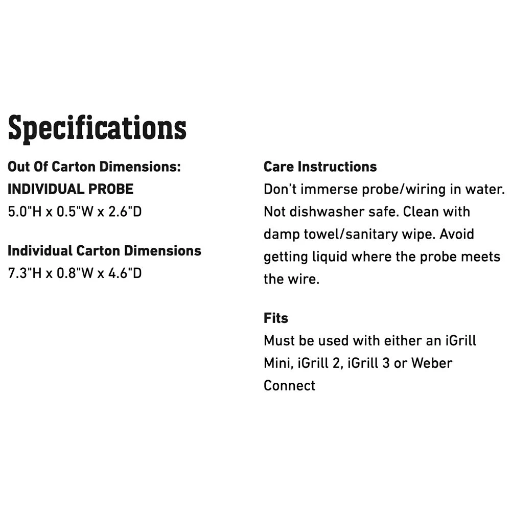 Weber iGrill Pro Meat Probe (WEB-7211) offers a smart replacement part for your Weber iGrill App-Connected Thermometer. Easy plug and play functionality makes it a snap to Connect this probe to your iGrill hub for accurate real time temperature tracking.